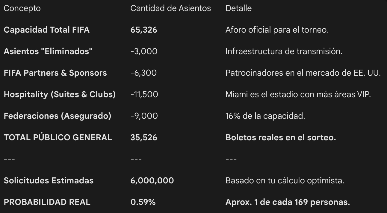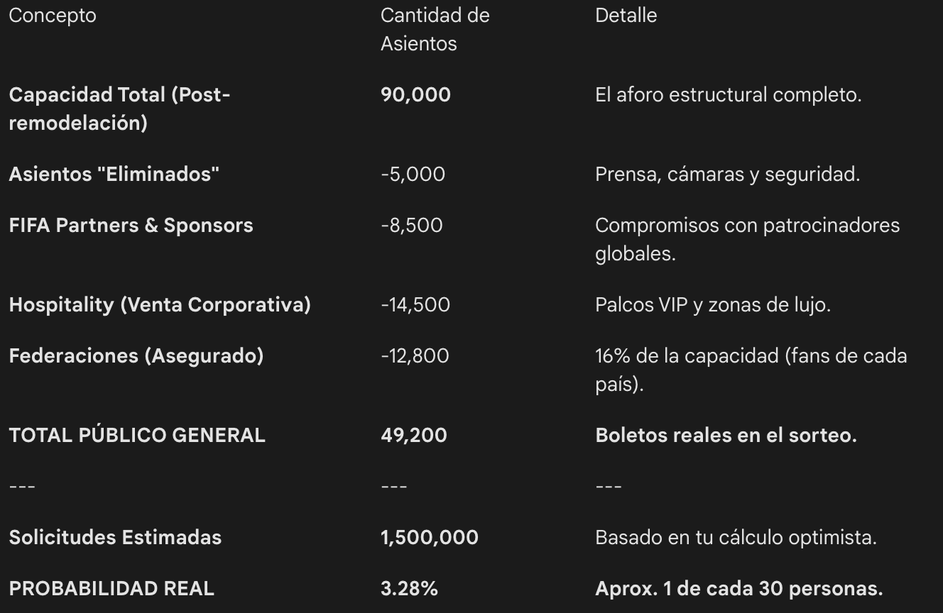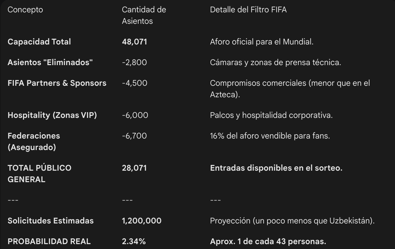 Comenzando con el debut de la Selección Colombia contra Uzbekistán en Ciudad de Mexico, este es quizás el escenario que genera más optimismo. Al ser un estadio con capacidad para 90,000 personas, las probabilidades parecen ser más altas; sin embargo, la realidad matemática es mucho más ajustada debido a los compromisos comerciales y técnicos de la FIFA.