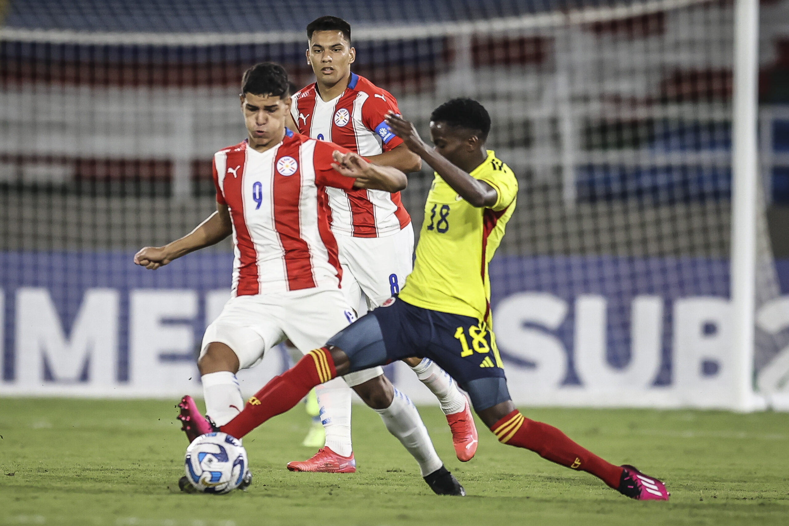 Los dirigidos por Héctor Cárdenas salieron a darlo todo en la cancha, pero recibieron un duro golpe cuando antes del minuto diez, el juez central sancionó una mano del capitán Gustavo Puerta que el delantero Allan Wik cambió por gol. La selección nacional no bajó la cabeza y generó acciones de peligro en la cabeza y los pies de Alexis Manyoma. Sin embargo, el marcador no se movió y Paraguay se fue con ventaja al descanso.