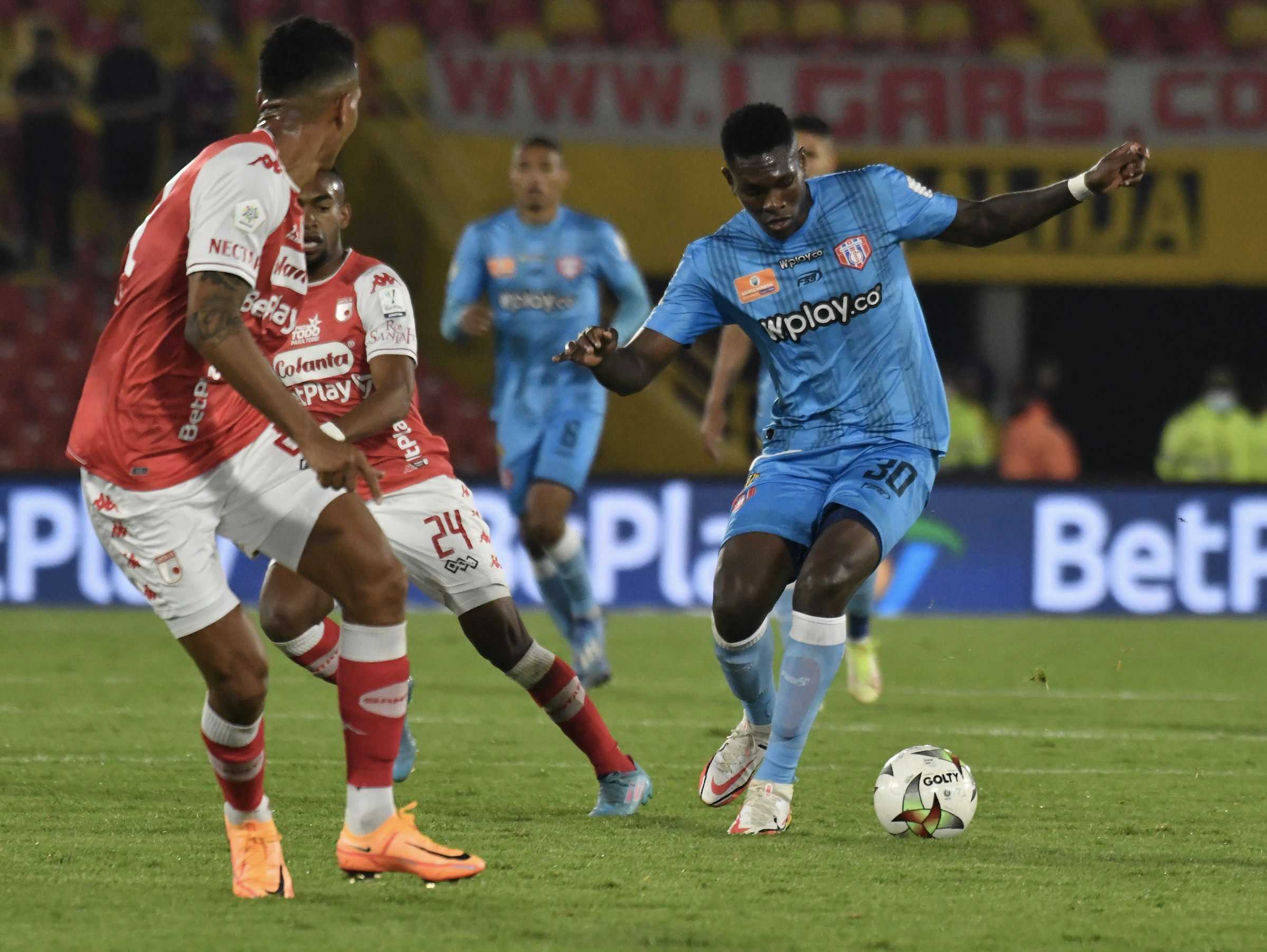 En el primer tiempo, Independiente Santa Fe tuvo más la pelota, pero no fue profundo para vencer a Ramiro Sánchez, finalizando esta primera mitad sin generar un solo remate a puerta. Por su parte, los visitantes buscaban dar la sorpresa y en más de una ocasión generaron acciones de peligro en el arco custodiado por Leandro Castellanos. Sin embargo, el cero no se rompió y todo se definió en la segunda parte.